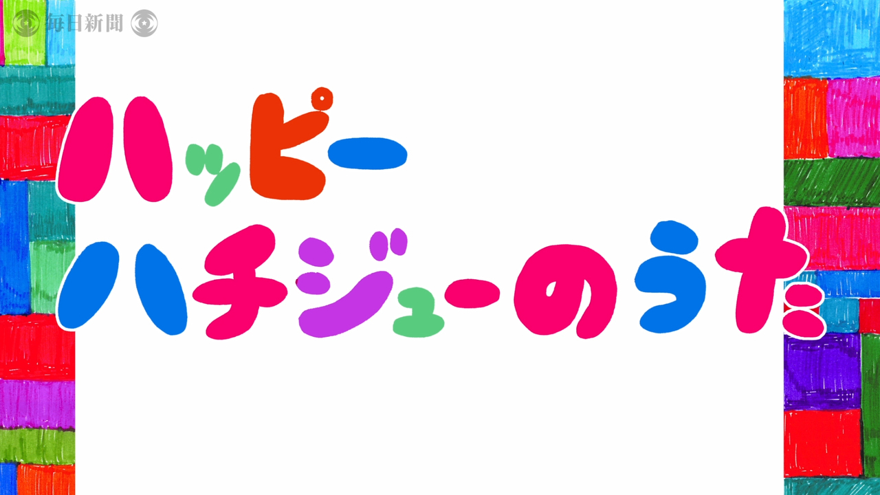22日、創刊80年を迎えた毎日小学生新聞。アーティストの井上涼さんと読者がアイデアを出し合い、この日のためにお祝いの歌「ハッピーハチジューのうた」とアニメーション作品を作った。井上さんが制作した毎小80年のゆるキャラ「ハチさんとジューくん」が登場。子供たちの合唱を収録した。【井上涼さん提供】