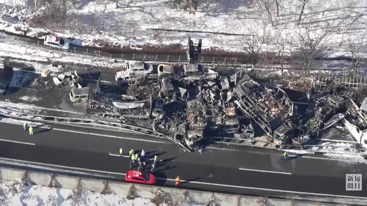 26日午後7時半ごろ、群馬県みなかみ町の関越自動車道下り線で、トラックや乗用車など67台が関係する多重事故があった。県警や消防によると、2人が死亡、5人が重傷、21人が軽傷を負った。火災が発生して20台が焼損し、約7時間半後に消し止められた。当時は雪が降っており、県警は路面凍結でスリップした可能性があるとみて調べている。(撮影・本社ヘリから本社ヘリから猪飼健史)2025年12月27日公開