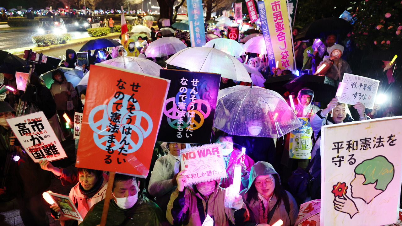 憲法改正に反対し、米国・イスラエルとイランの戦闘に抗議するデモが日夜、東京都千代田区の国会前であった。雨が降る中、参加した約2万4000人(主催者発表)は国会周辺の歩道を埋め尽くし、ペンライトを振ったりプラカードを掲げたりして「改憲反対」「武力で平和はつくれない」などと声をあげた。【撮影・後藤由耶】2026年3月25日公開