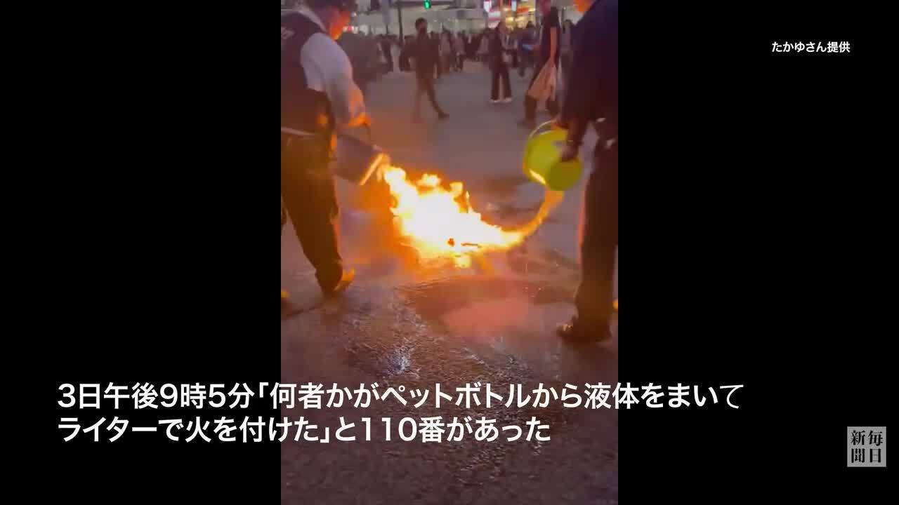 3日午後9時5分ごろ、東京都渋谷区道玄坂2のスクランブル交差点で「何者かがペットボトルから液体をまいてライターで火を付けた」と110番があった。火は交差点中央付近で燃え上がったが、駆けつけた警察官らによって間もなく消し止められた。けが人はなかった。(通行人提供)2026年4月4日公開