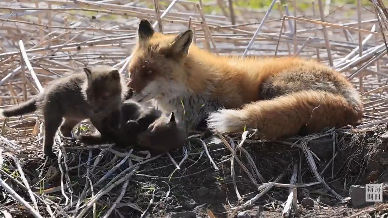 札幌市内の住宅街近くの土手でキタキツネが子育てをしている。少し黒っぽい色をした6頭の子ギツネが巣穴から飛び出してじゃれ合ったり、近くで見守る親キツネにくっついたりして過ごしている。【撮影・宮間俊樹】2026年4月24日公開